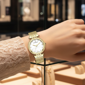 Yuvarlak 28 mm çelik kasa, kadın bileğine mükemmel uyum sağlarken uzun ömürlü kullanım sunar.