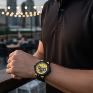 Sarı kadran + siyah kasa: cesur ve sportif tasarım