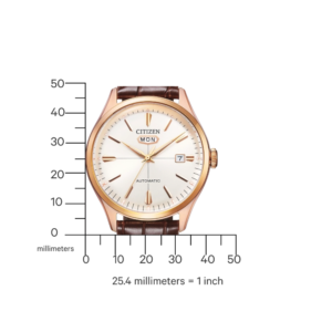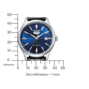 Citizen’in güvenilir 8200 serisi otomatik mekanizması, pil gerektirmeden çalışır ve yaklaşık 42 saat güç rezervi sunar. Gün ve tarih göstergesi (day-date) sayesinde fonksiyonellik de ön plandadır.