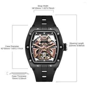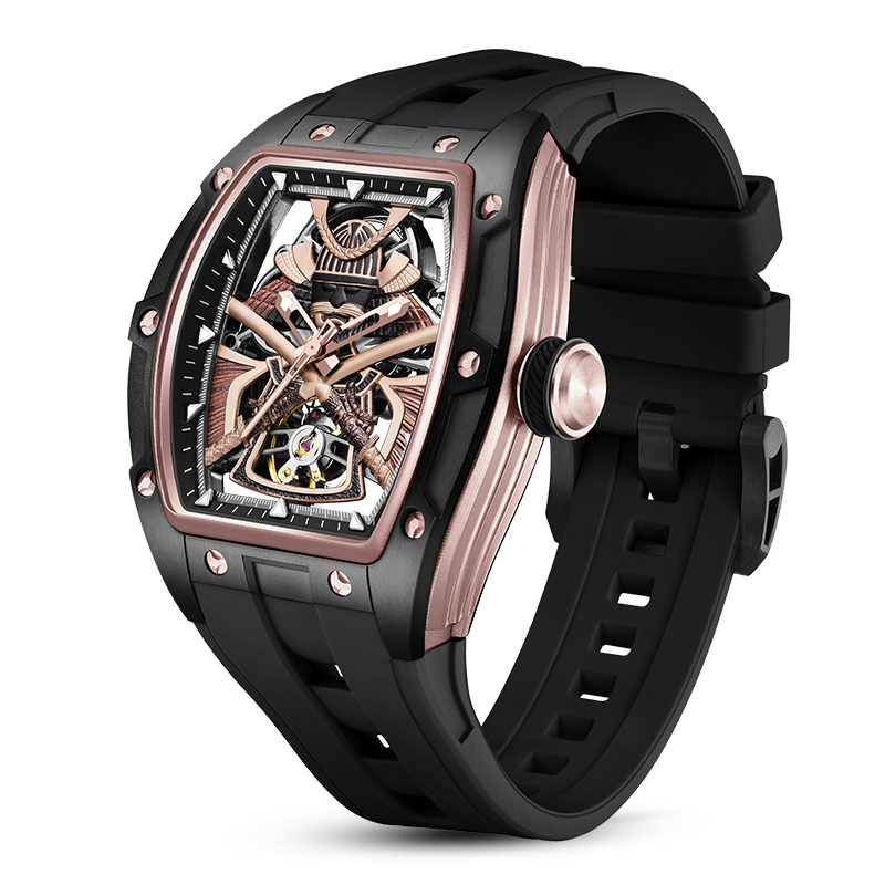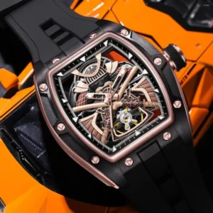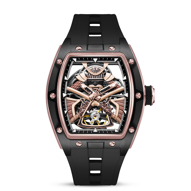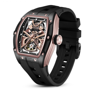 Cesur tonneau kasa formu ve tamamen görülebilen iskelet mekanizmasıyla öne çıkan AD9070, modern saat tasarımının güçlü bir temsilcisidir. Siyah paslanmaz çelik kasa, pembe altın detaylı köprüler ve üç boyutlu ibrelerle etkileyici bir derinlik sunar. Safir kristal camı sayesinde üstün çizilme direnci sağlarken, ergonomik silikon kayışı sportif konfor kazandırır.