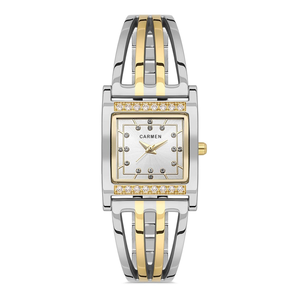 Carmen CR.1.AG0105.01 modeli, kare kasa formu ve dikkat çekici sarı çelik kordonuyla stilinize enerjik ve şık bir dokunuş katar. Günlük kullanımda rahatlık, özel anlarda ise zarafet sunar.