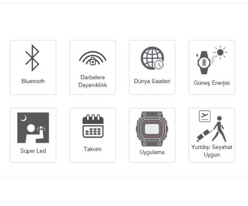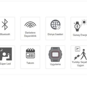 Saat, adım takibi ve veri görüntüleme işlevlerinde güneş enerjili sistemini kullanırken; Bluetooth® bağlantısıyla akıllı telefonunuzla kusursuz şekilde eşleşir. CASIO WATCHES uygulaması üzerinden otomatik zaman senkronizasyonu sağlanır ve yaşam günlüğü verilerinizi zahmetsizce yönetebilirsiniz. Dünya saati, kronometre ve gövdenin önündeki büyük tuşla etkinleştirilen yüksek parlaklıkta  LED ışık gibi fonksiyonlar günlük kullanımda büyük kolaylık sağlar. Fosfor kaplamalı göstergeler ise düşük ışıkta bile hızlı ve net okuma imkânı sunar.