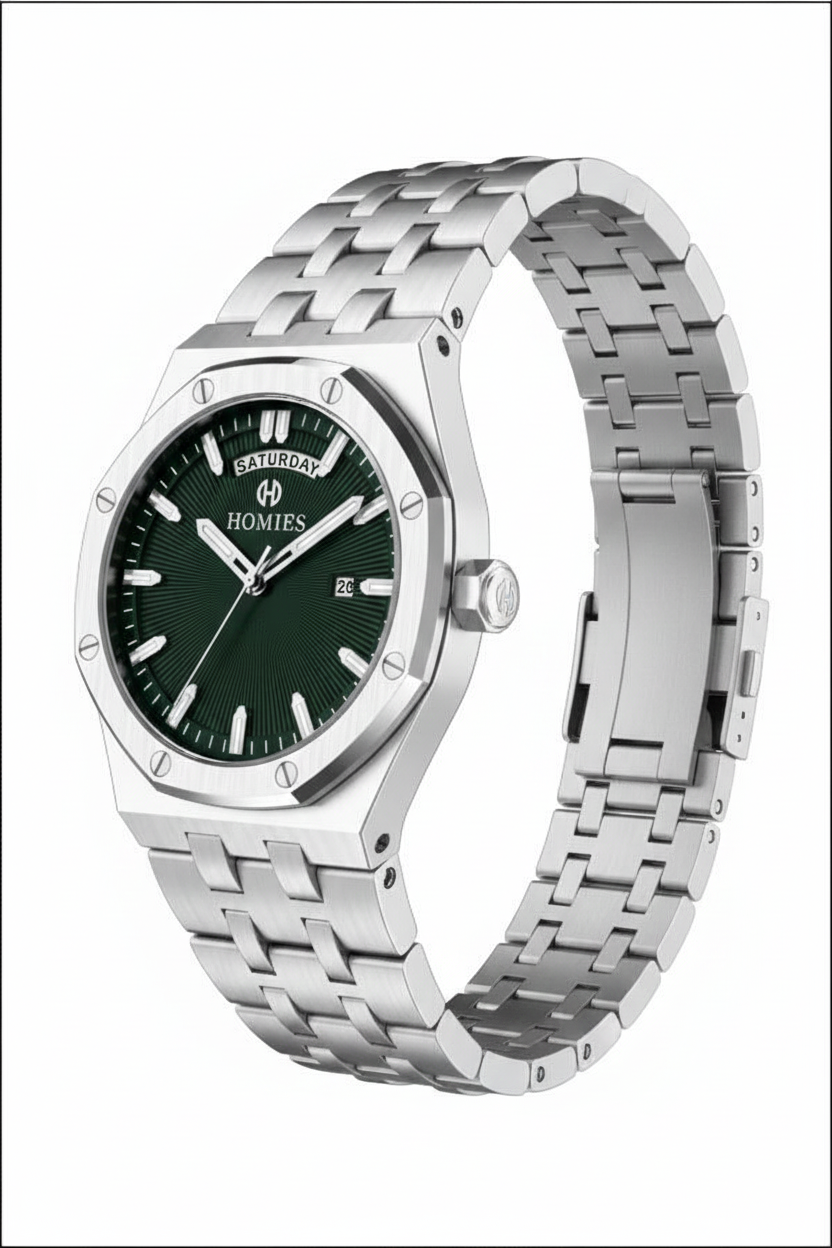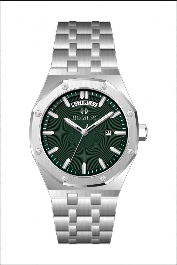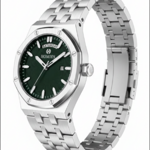 Modern tasarımı ve yeşil kadranın dikkat çekici şıklığı ile öne çıkan HOMIES HM26098S01-3, günlük ve klasik kombinlere kolayca uyum sağlayan güçlü bir erkek kol saatidir. Gümüş renk çelik kordonu ve geniş kasa yapısı sayesinde bilekte maskülen ve dengeli bir duruş sunar.