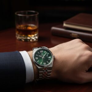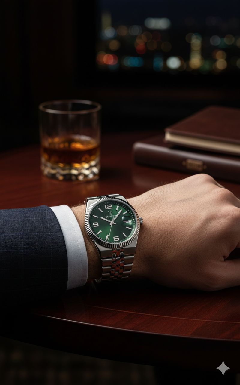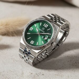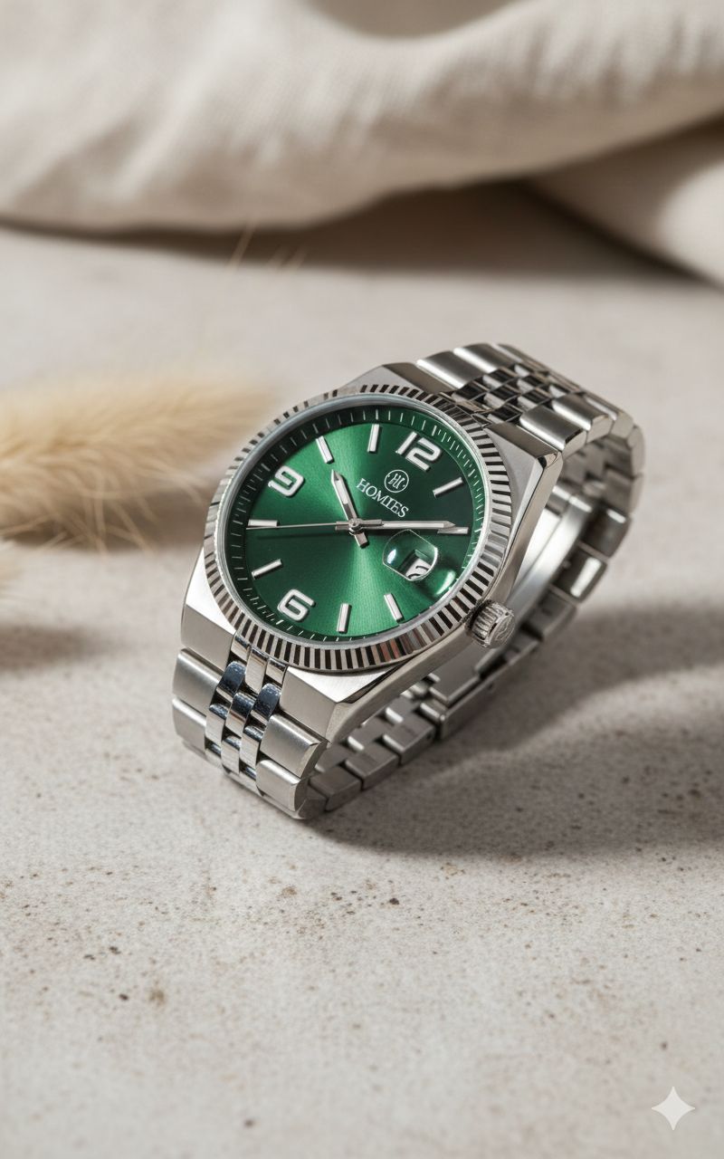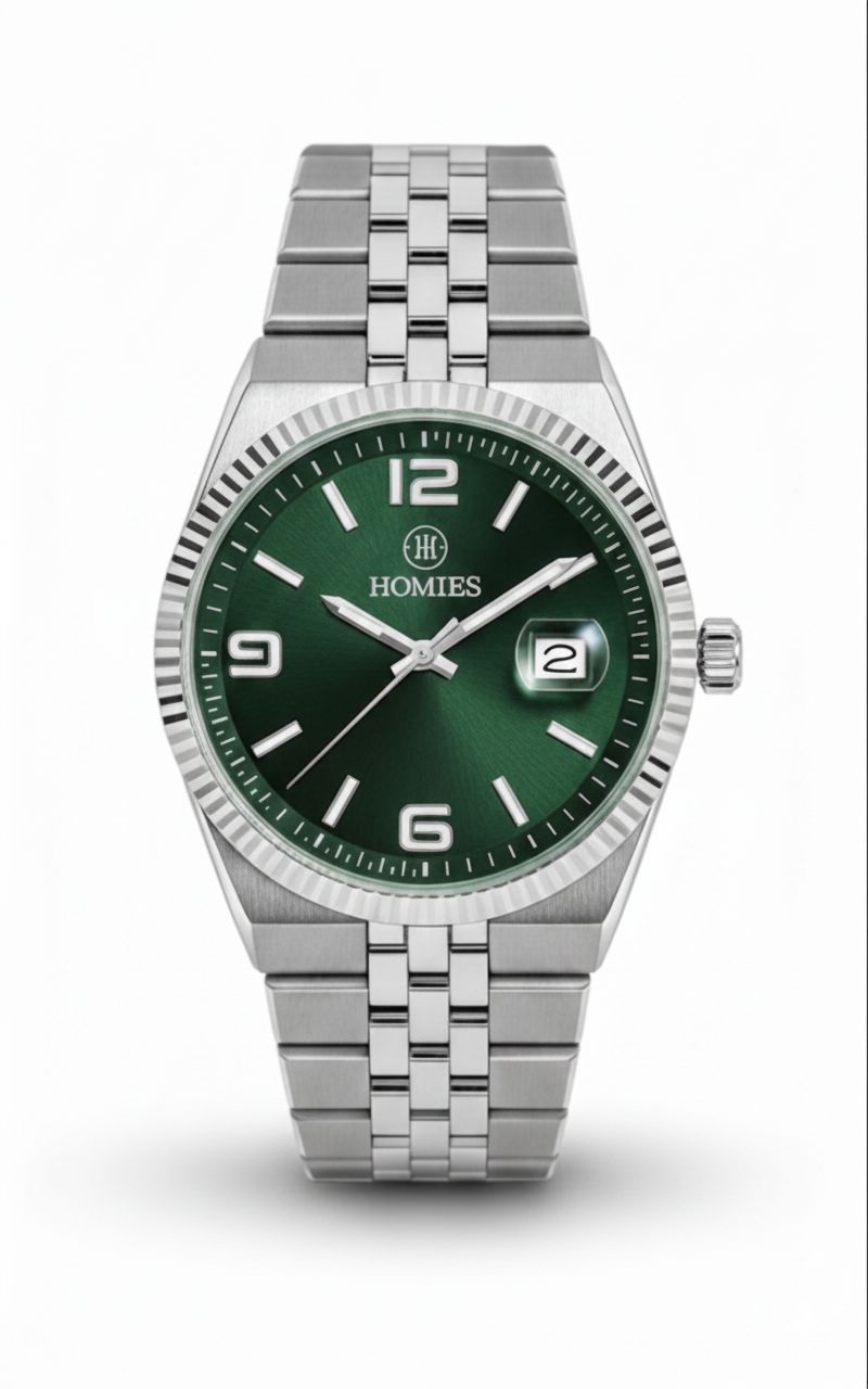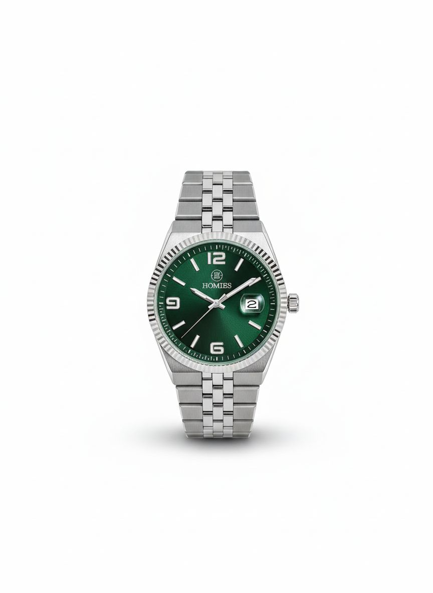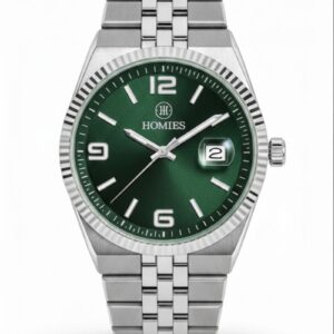 Modern tasarımı ve güçlü detaylarıyla öne çıkan HOMIES HM27287S01-5 sportif şıklığı klasik çizgilerle buluşturan özel bir erkek kol saatidir. Tırtıklı bezel yapısı saate karakteristik ve dinamik bir görünüm kazandırırken, yeşil gofret kadranı derinlikli ve prestijli bir duruş sunar.