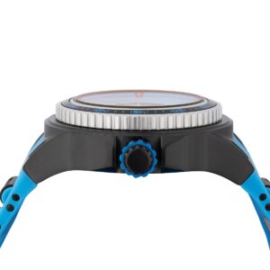 Siyah, mavi ve gümüş tonlara sahip çelik bezel detayı, saate sportif ve modern bir görünüm kazandırır.