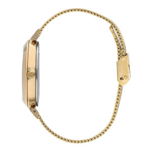 Altın renk örgü (mesh) kordonu sayesinde hem şık hem de konforlu bir kullanım sunan bu model, günlük kombinlerden özel davetlere kadar her anınıza zarafet katmak için tasarlanmıştır.