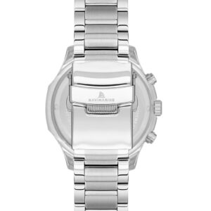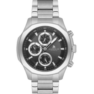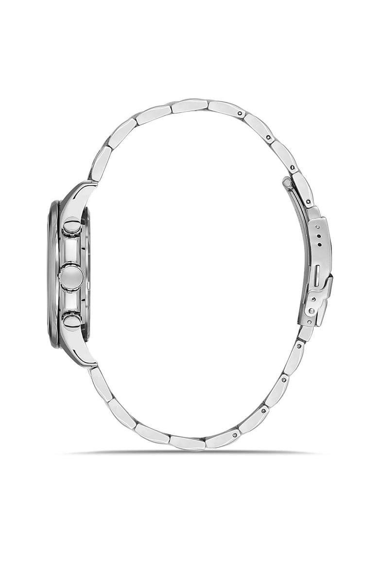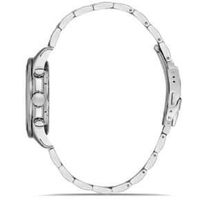 Siyah kadranın zarif görünümü, gümüş çelik kordonla birleşerek güçlü bir kontrast oluşturur. 44 mm kasa çapı ile maskülen bir stil sunan bu model, aktif çalışan fonksiyonları ve takvim özelliğiyle sadece şık değil aynı zamanda kullanışlıdır. Japon Quartz mekanizması sayesinde hassas zaman ölçümü ve güvenilirlik sağlar.
