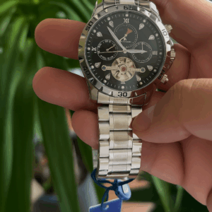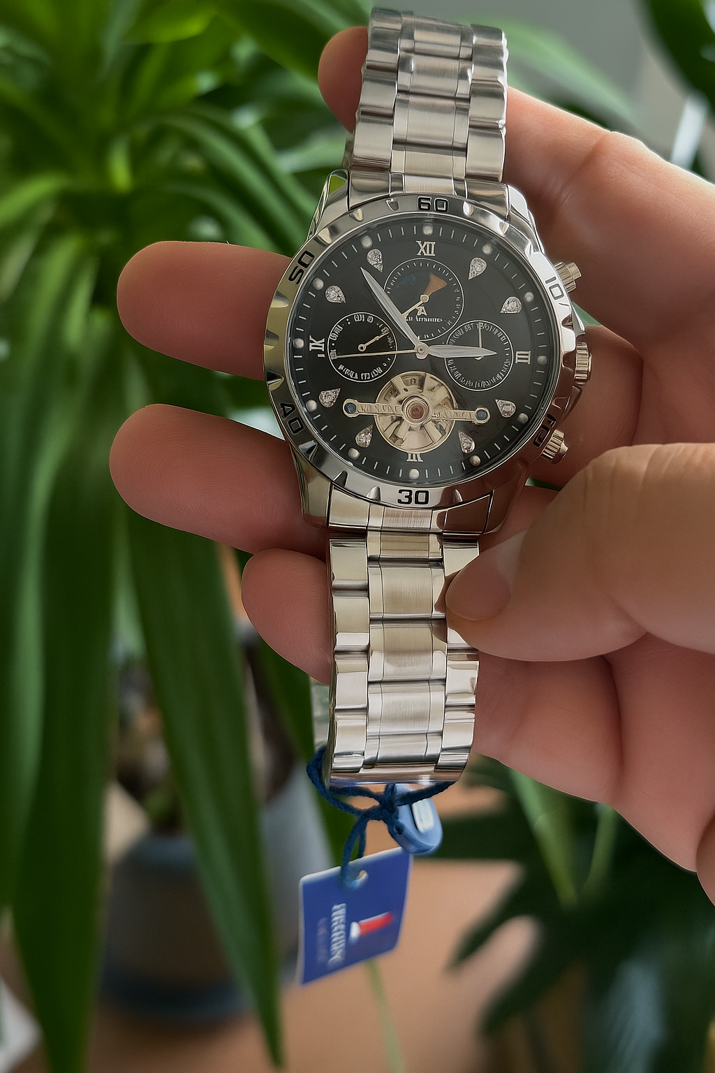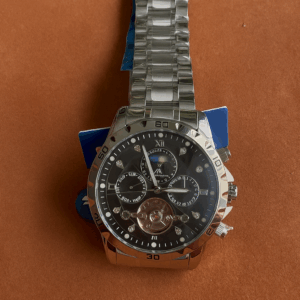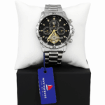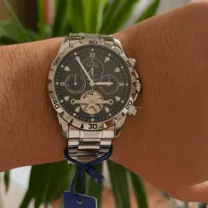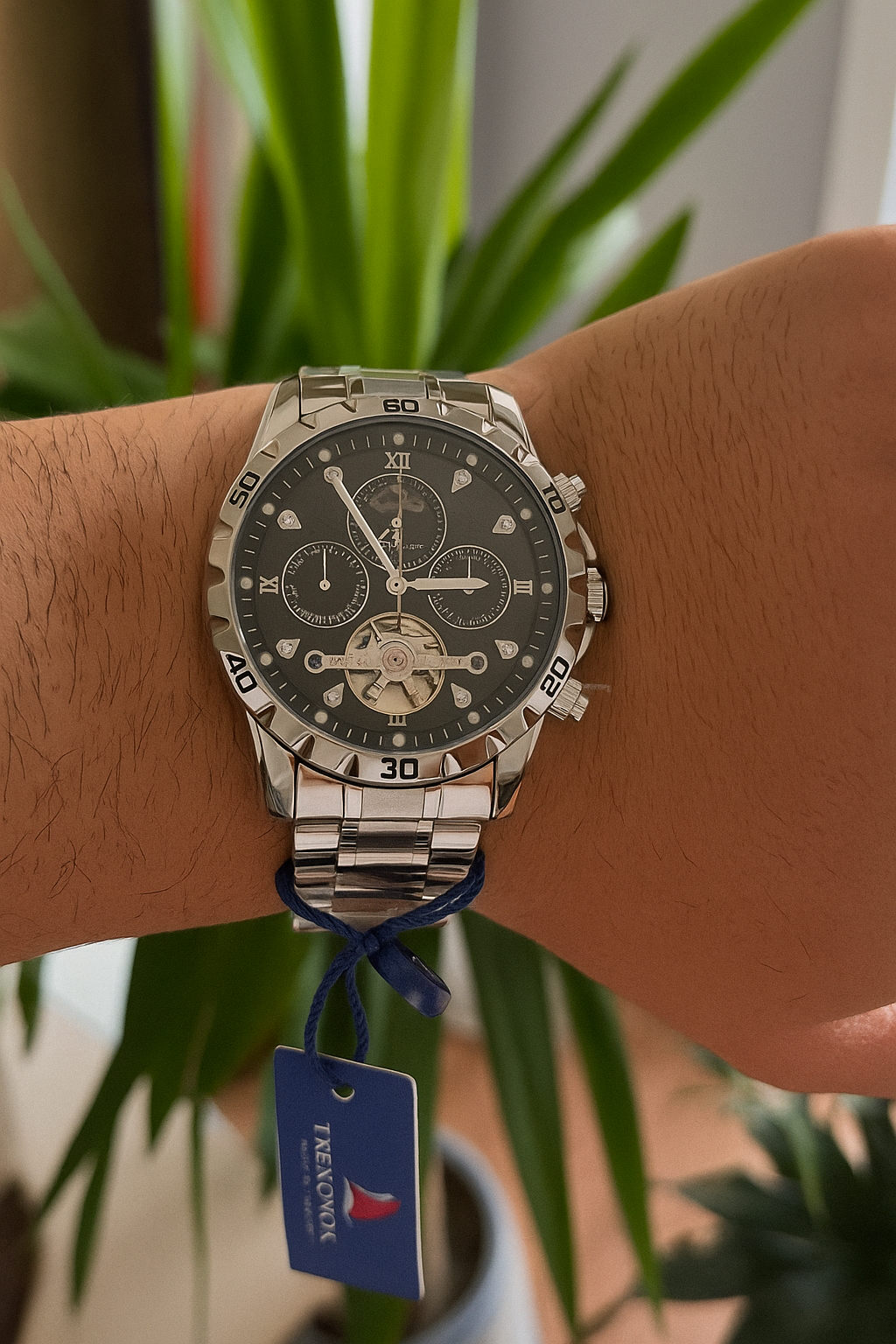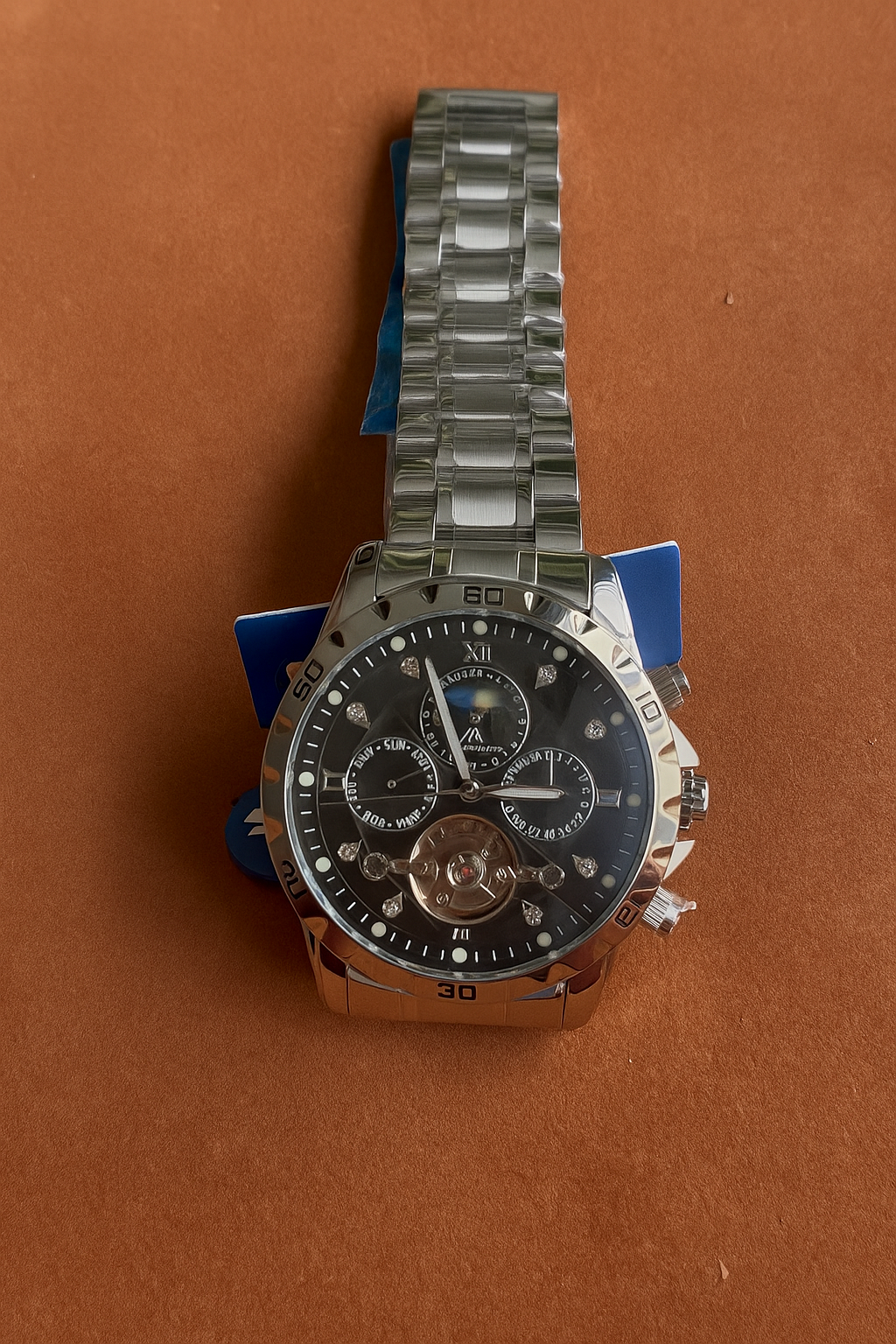 Kadran: Siyah zemin gümüş detay mehtaplı tasarım & kronograf fonksiyonları