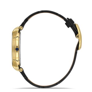 Siyah deri kordon, yumuşak dokusu sayesinde bilekte konforlu bir kullanım sağlarken, klasik stil sevenler için zamansız bir tercih oluşturur. Deri kordon, altın kasa ile güçlü bir kontrast yaratarak saatin şıklığını ön plana çıkarır.