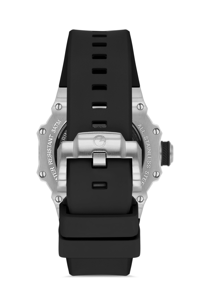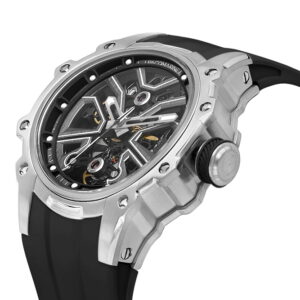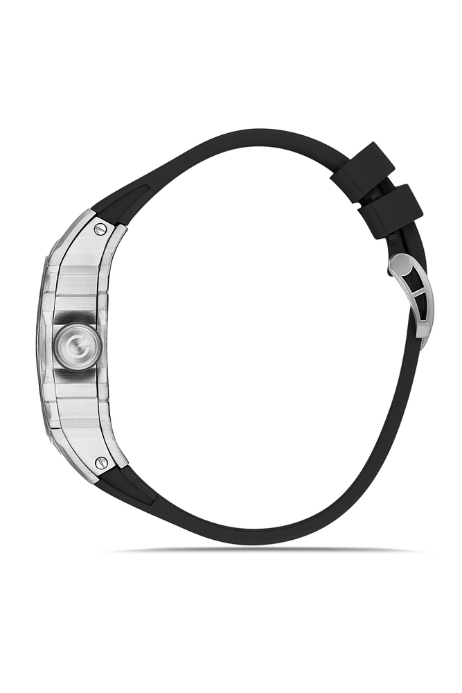 İskelet kadran, mekanizmanın dinamizmini ön plana çıkarırken; siyah silikon kordon sportif konfor ve modern görünüm sağlar. 43 mm çelik kasa bilekte güçlü bir duruş sunar. Günlük kullanım, spor kombinler ve vitrin sunumları için ideal bir modeldir.