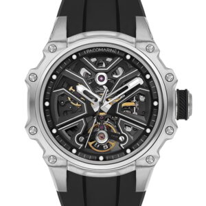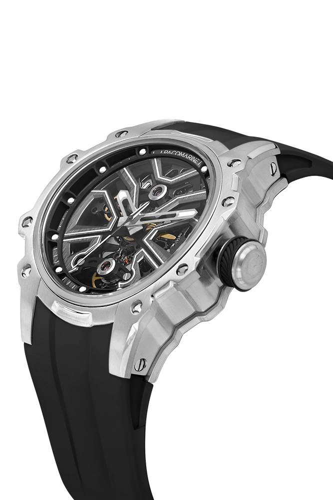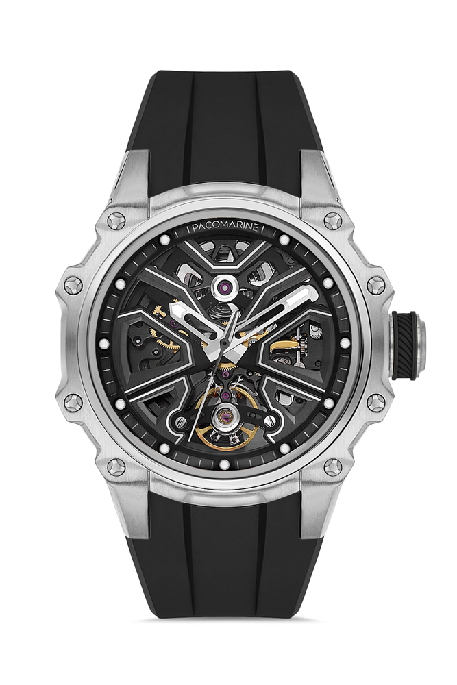 Modern çizgiler, mekanik estetik ve sportif karakter tek bir modelde buluşuyor. Pacomarine PM.24501.01, iskelet kadranı ve siyah silikon kordonuyla güçlü bir stil ortaya koyarken, safir camı ve çelik kasasıyla uzun ömürlü kullanım sunar.