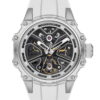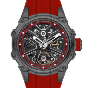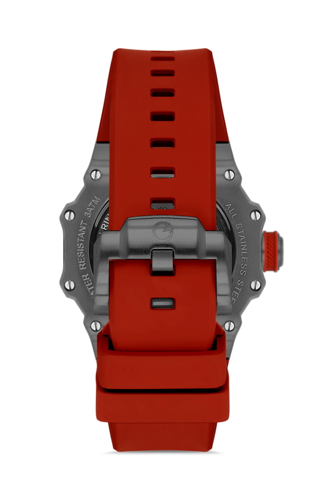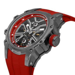 Kırmızı silikon kordonu ile sportif enerjiyi yansıtan bu model, iskelet kadran tasarımı sayesinde saat tutkunlarına mekanik estetiği doğrudan sunar. Büyük kasa çapı bilekte güçlü bir duruş sağlarken, safir kristal cam uzun ömürlü kullanım vadeder.