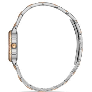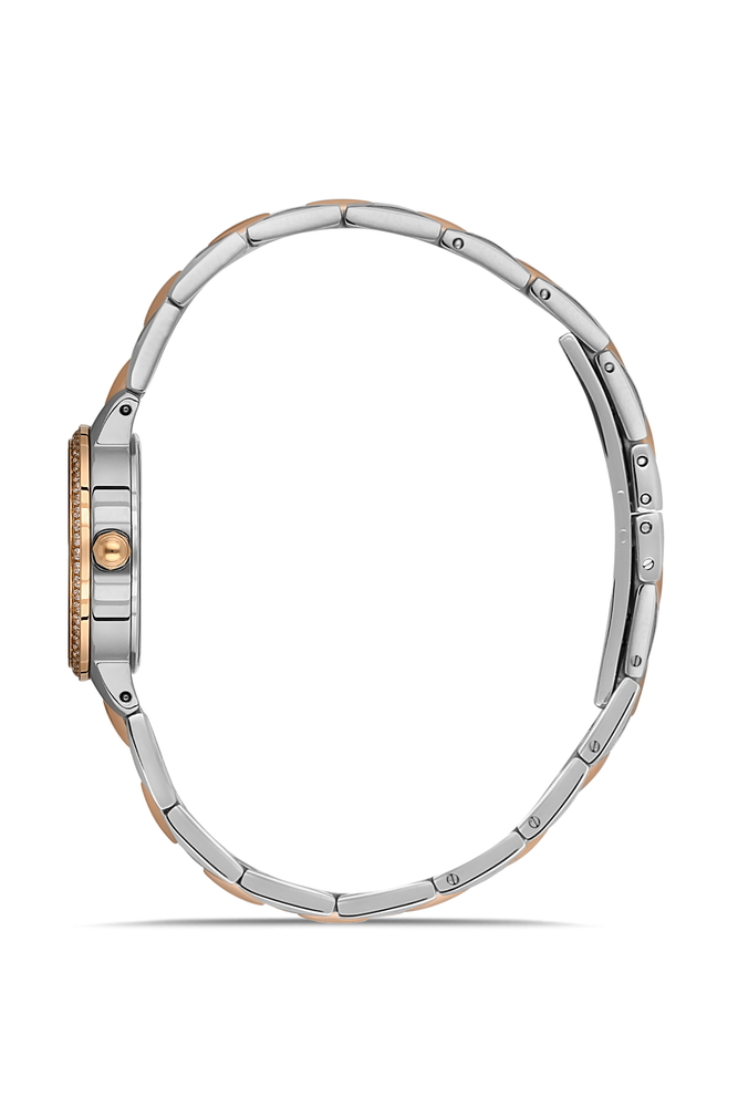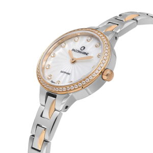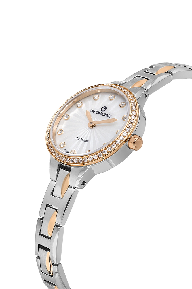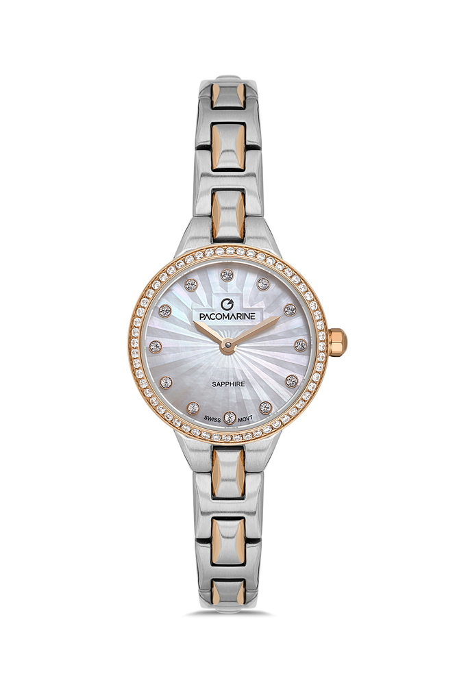 Pacomarine PM.24502.03, gri taşlı kadranı ve taş detaylı bezel tasarımıyla feminen şıklığı ön plana çıkarır. Yuvarlak kasa formu klasik bir duruş sunarken, çelik bileziği modern ve sağlam bir yapı kazandırır.