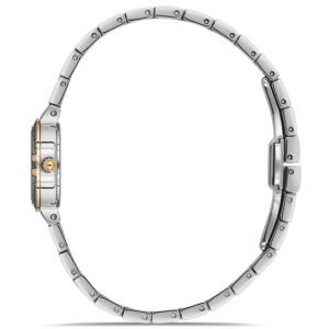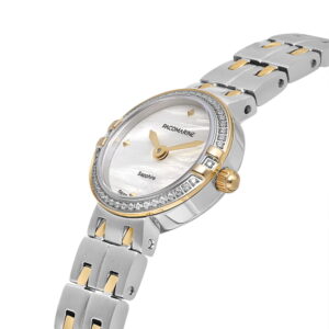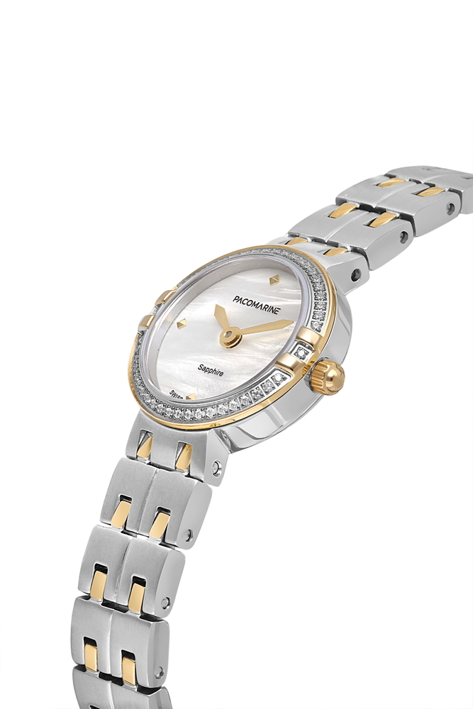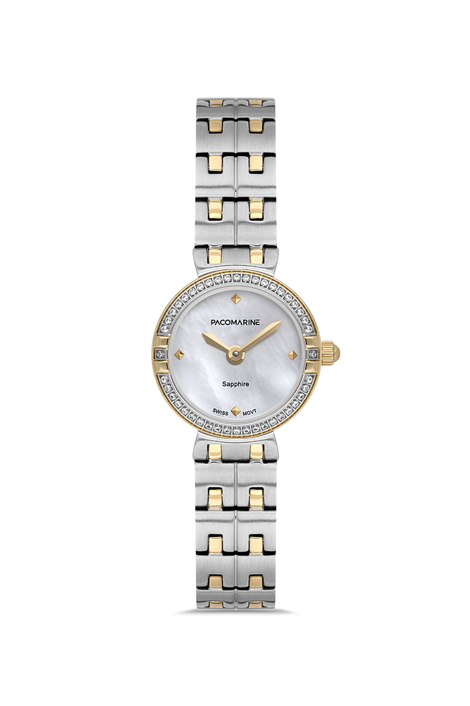 Pacomarine PM.24503.02, sedef kadranı ve gri/altın çelik bilezik kombinasyonu ile klasik ve modern çizgileri bir araya getirir. 26 mm kasa çapı sayesinde ince ve zarif bir duruş sunar; günlük kullanımda konforlu, özel günlerde ise şık bir tamamlayıcıdır.