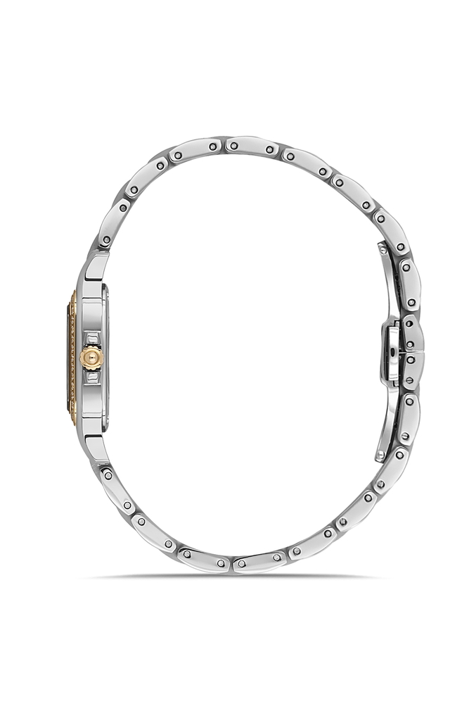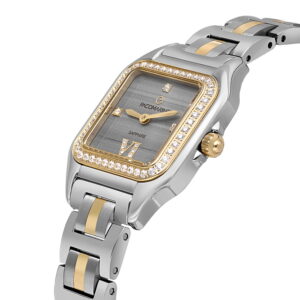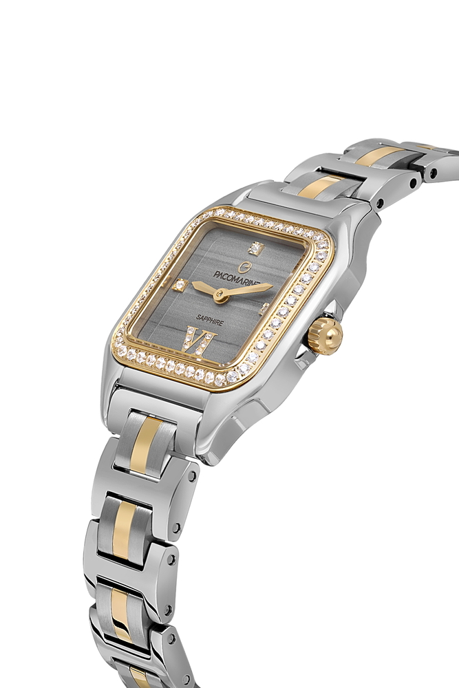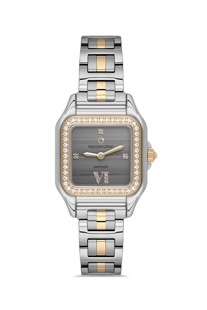 Pacomarine PM.24505.01, kare kasa tasarımı ve parlak cilalı yüzeyiyle klasik kadın saat anlayışına modern bir yorum katıyor. 36 mm kasa çapı sayesinde bilekte belirgin ama zarif bir duruş sergiler.
