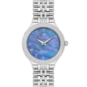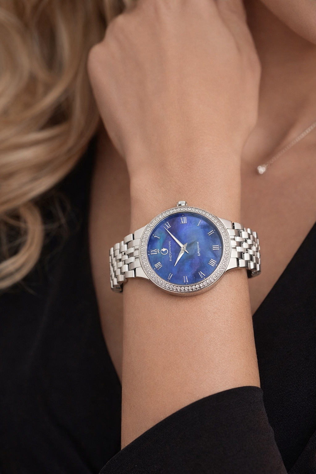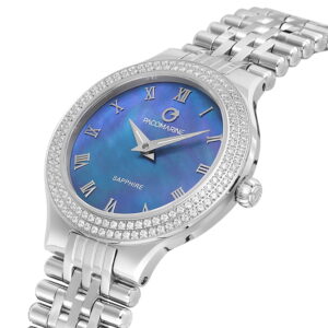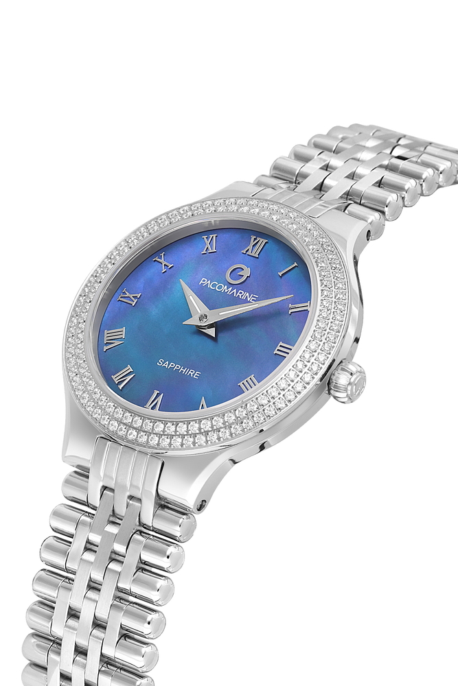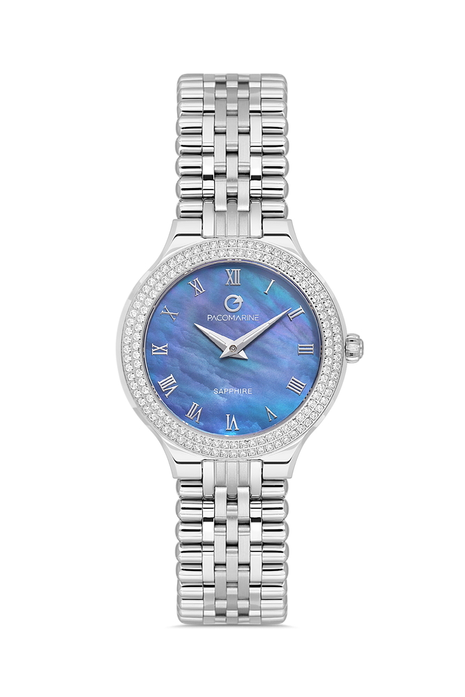 Pacomarine PM.25401.03, lacivert sedef kadranı ve taş detaylı bezel tasarımıyla ışığı her açıdan yansıtan, feminen ve sofistike bir saat deneyimi sunar.