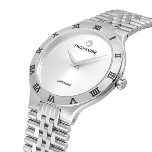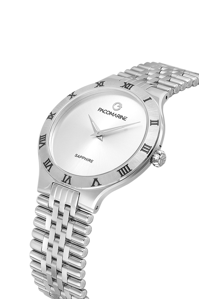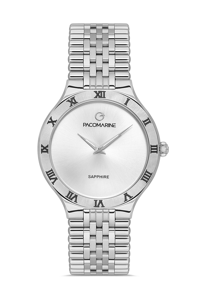 Pacomarine PM.25402.01, modern çizgileri klasik detaylarla buluşturan tasarımıyla günlük stilinize prestij katar. İnce (slim) kasa yapısı sayesinde bilekte hafif ve konforlu bir kullanım sunarken, açık gri kadranı ve Roma rakamlı bezel tasarımı ile dikkat çekici bir şıklık sağlar.