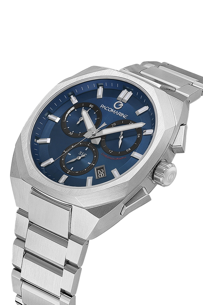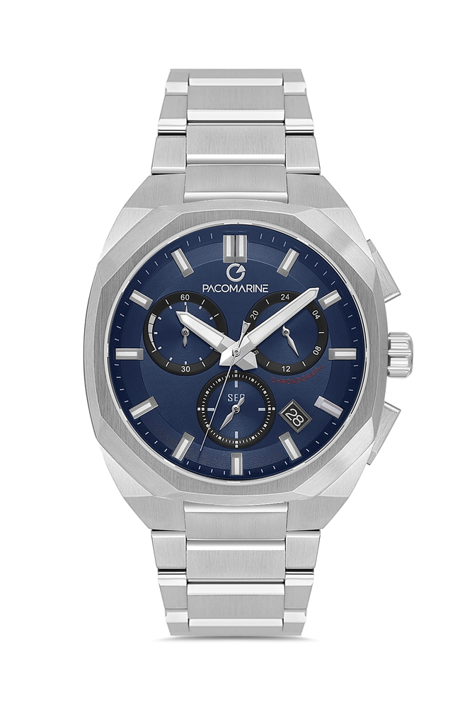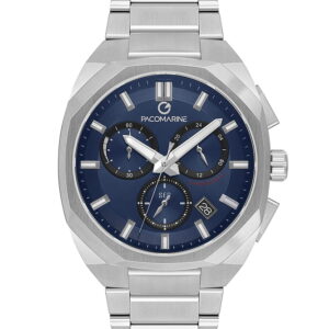 Pacomarine PM.25406.05, 45 mm geniş kasa çapı ve kronograf detaylarıyla sportif ve iddialı bir duruş sergiler. Small Second göstergesi tasarıma teknik bir karakter kazandırırken, lacivert kadran modern ve şık bir görünüm sunar.