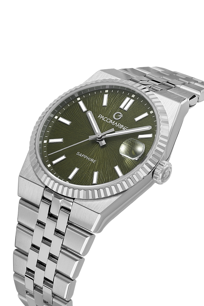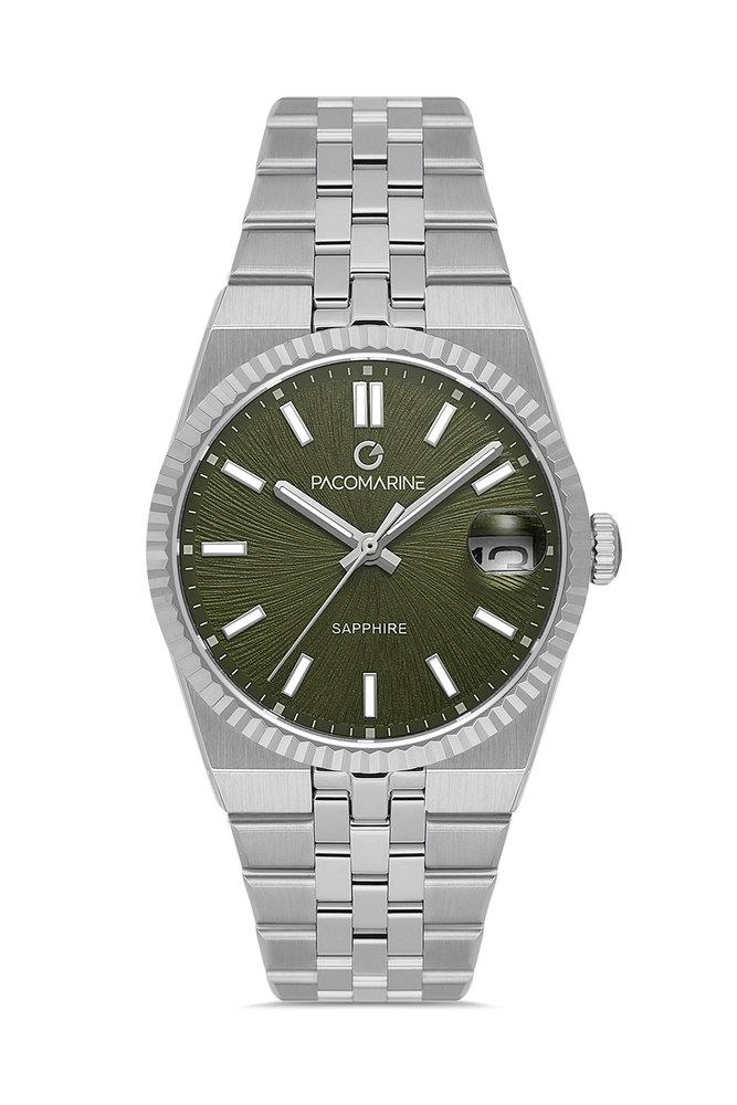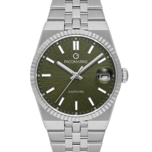 Güçlü duruşu ve sofistike rengiyle öne çıkan Pacomarine PM.25410.05, klasik saat anlayışına modern bir yorum katıyor. Zeytin yeşili kadranı, jübile çelik bileziğiyle birleşerek hem dikkat çekici hem de zamansız bir stil sunar.