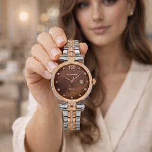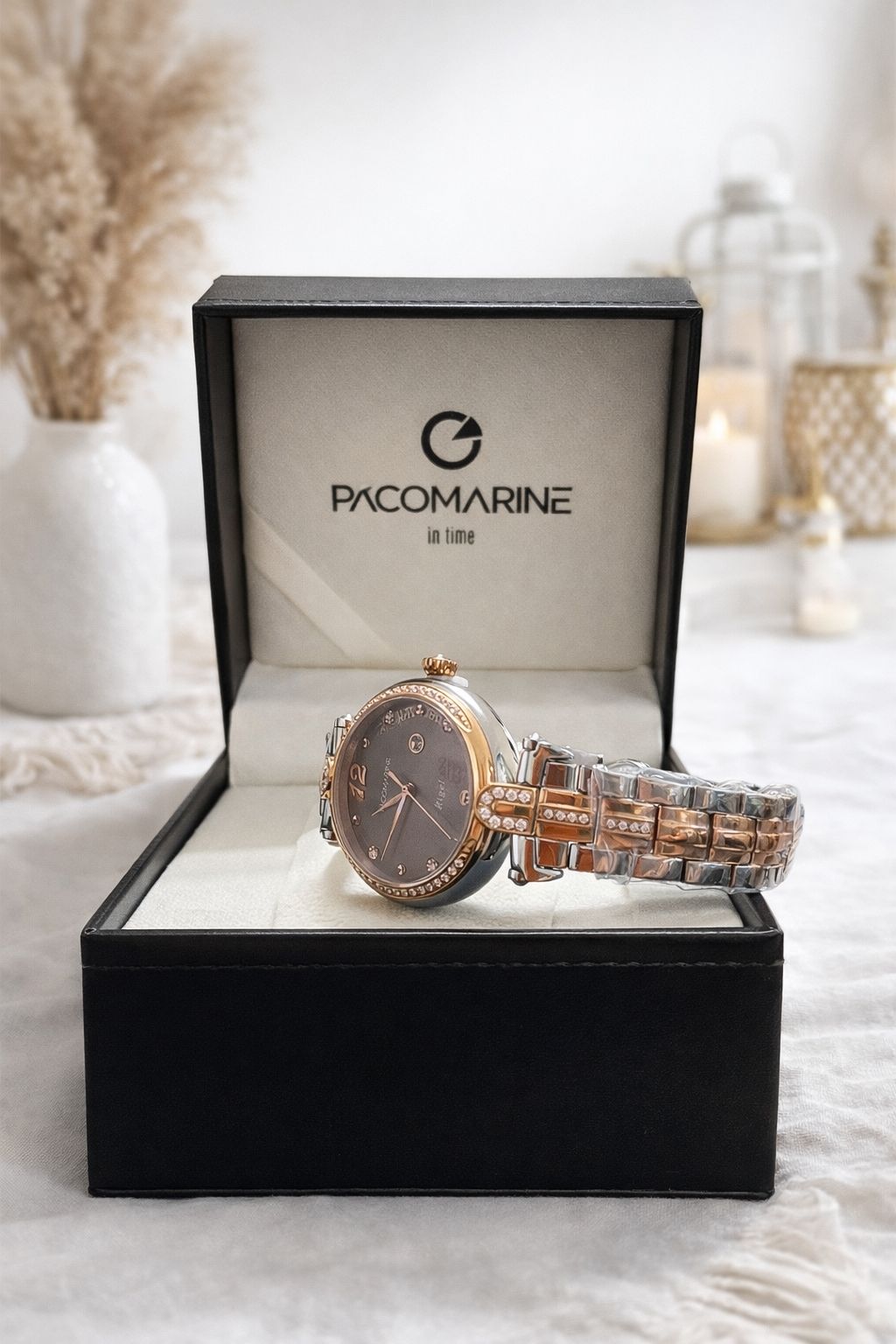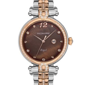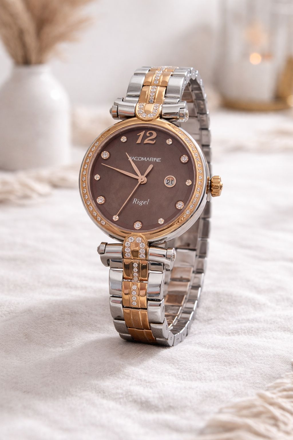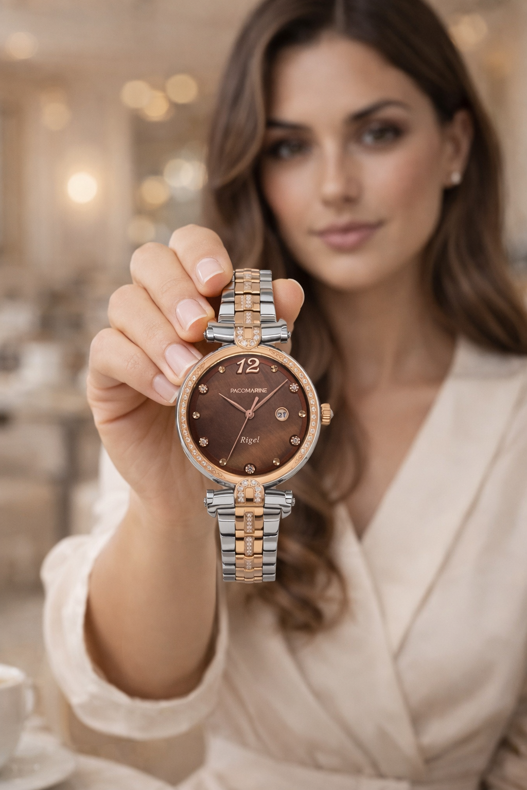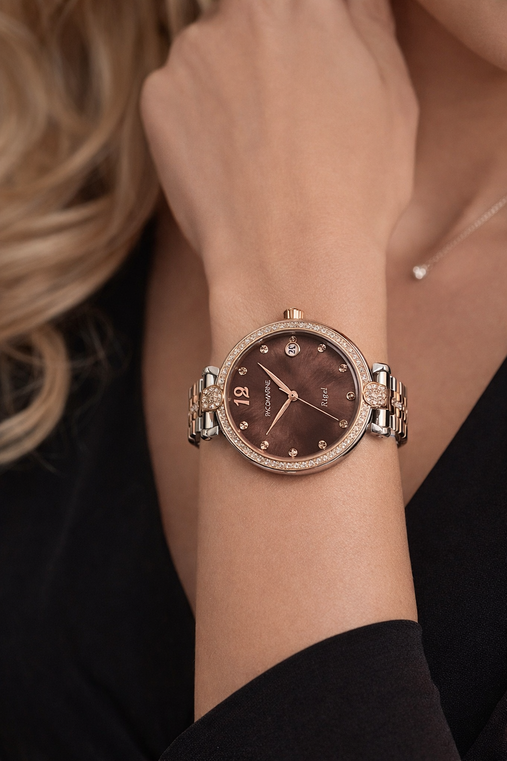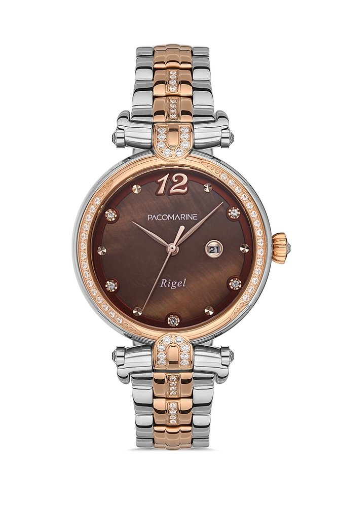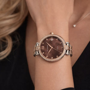 Taş detaylarla süslenmiş kahverengi kadranı ve rose gri tonlarının uyumu, sofistike bir stil sunarken, ışığı her açıdan yansıtan ışıltısıyla dikkatleri üzerinize çeker.