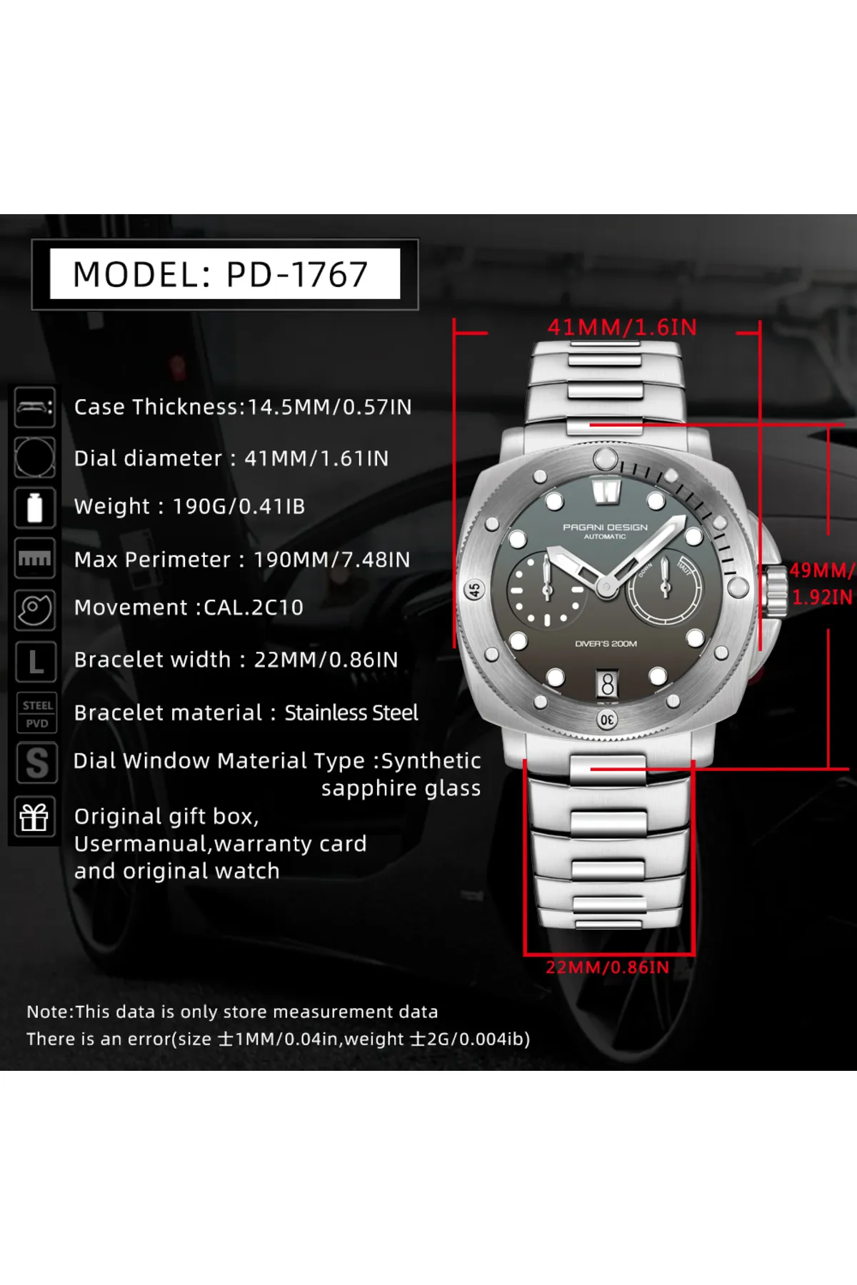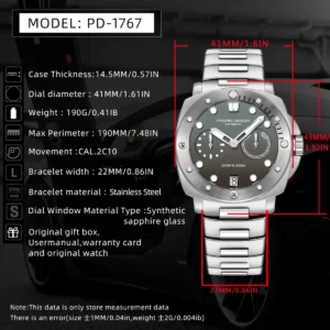 Pagani Design PD-1767, sportif tasarımı ve güçlü teknik özellikleriyle günlük kullanımda şıklık ve dayanıklılığı bir araya getiren özel bir otomatik saat modelidir. 41 mm paslanmaz çelik kasa yapısı, AR kaplamalı safir kristal camı ve yüksek hassasiyetli CAL.2C10 otomatik mekanizması ile hem performans hem de estetik açıdan dikkat çeker.