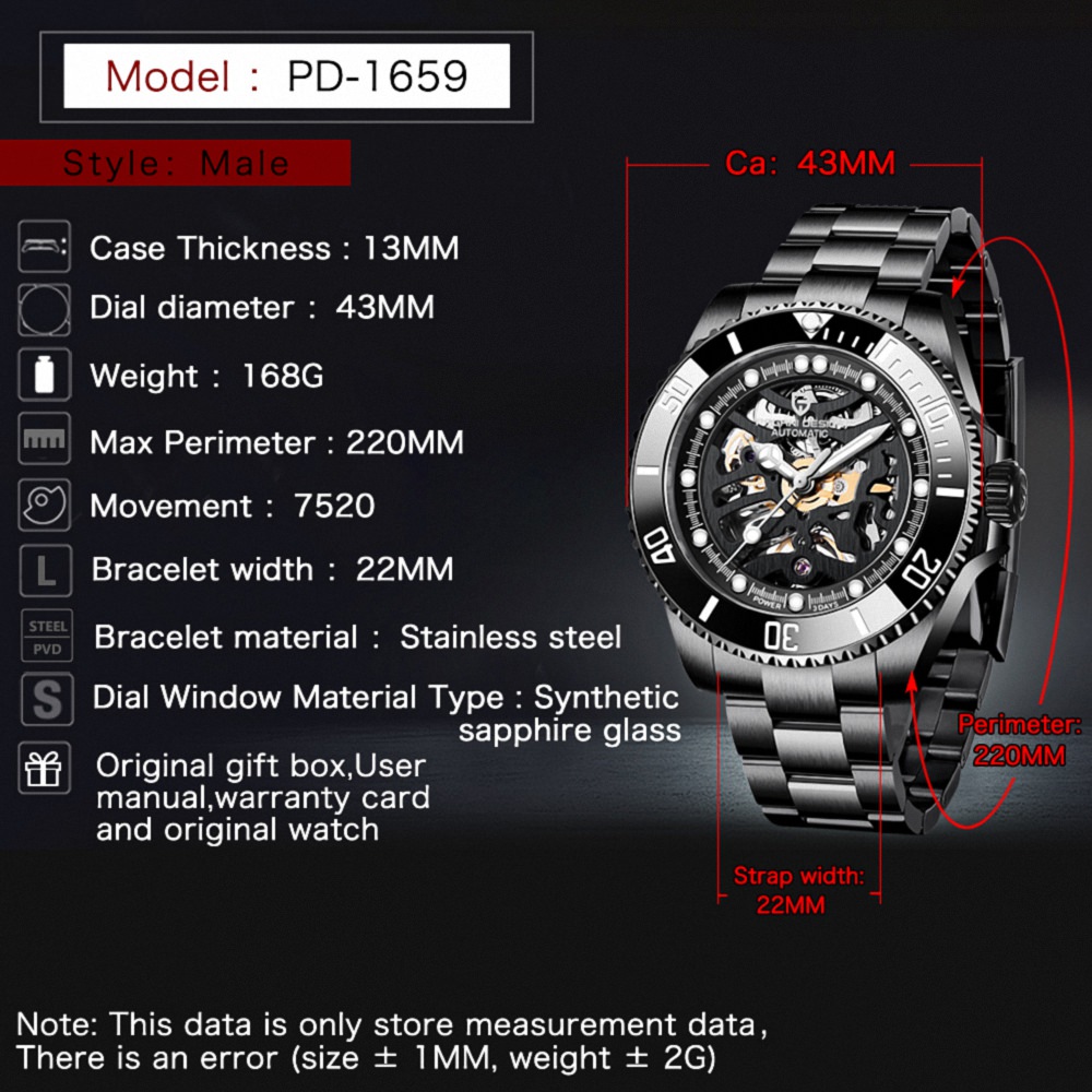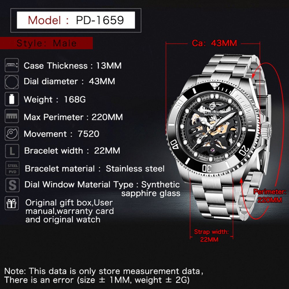 Güçlü tasarımı ve premium duruşuyla öne çıkan Pagani Design PD-1659, lüks ve iş stilini bir araya getiren iddialı bir erkek kol saatidir. Otomatik kendinden kurmalı mekanizması, safir kristal camı ve 10 Bar (100 metre) su geçirmezlik seviyesiyle hem günlük kullanımda hem de aktif yaşamda maksimum performans sunar. Fosforlu akrep-yelkovan yapısı sayesinde gece ve düşük ışıkta bile zamanı net şekilde okumanızı sağlar.