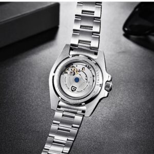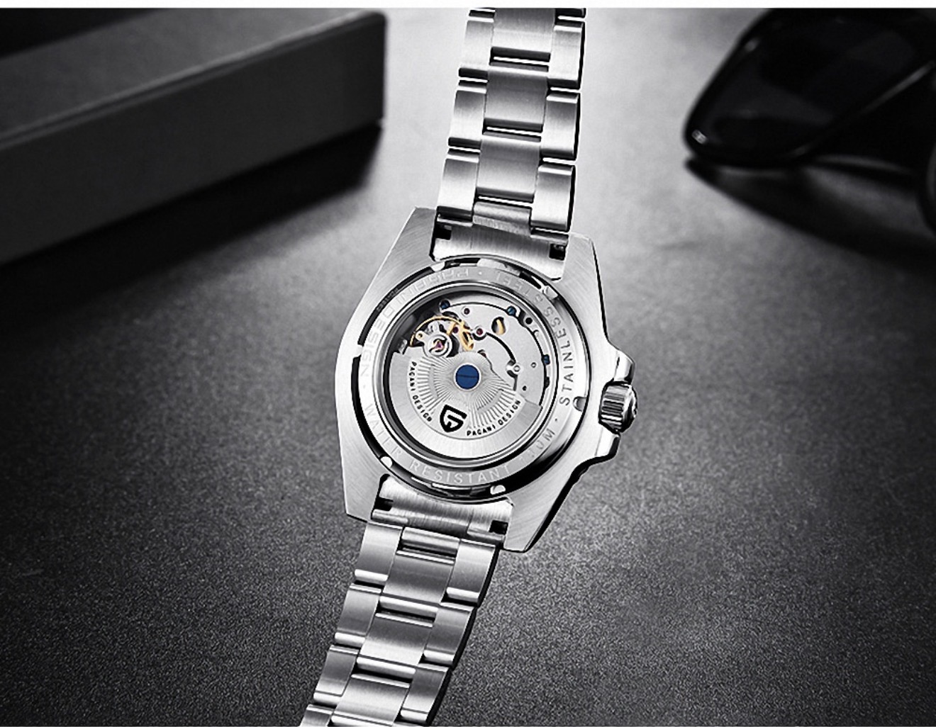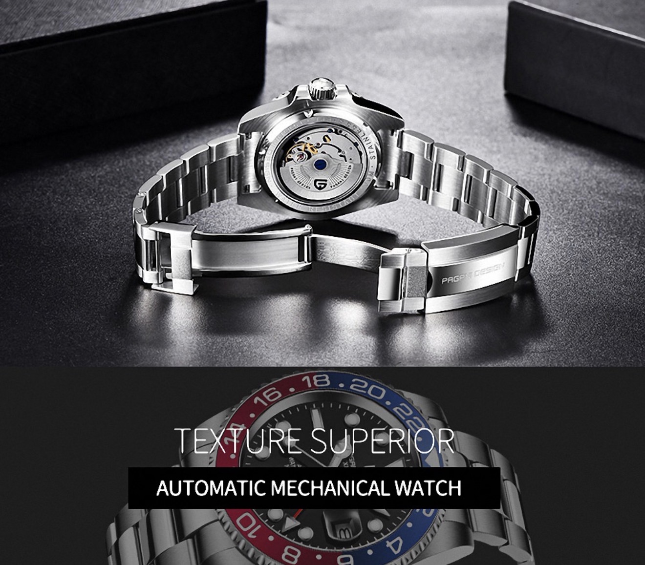 Pagani Design PD1662 modeli GMT özelliği, tam takvim fonksiyonu ve dayanıklı paslanmaz çelik yapısıyla günlük kullanım ve seyahatler için ideal bir mekanik saattir. Hem sağlamlığı hem de fonksiyonlarıyla öne çıkan bir tasarımdır.
