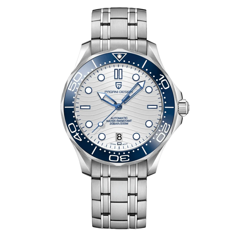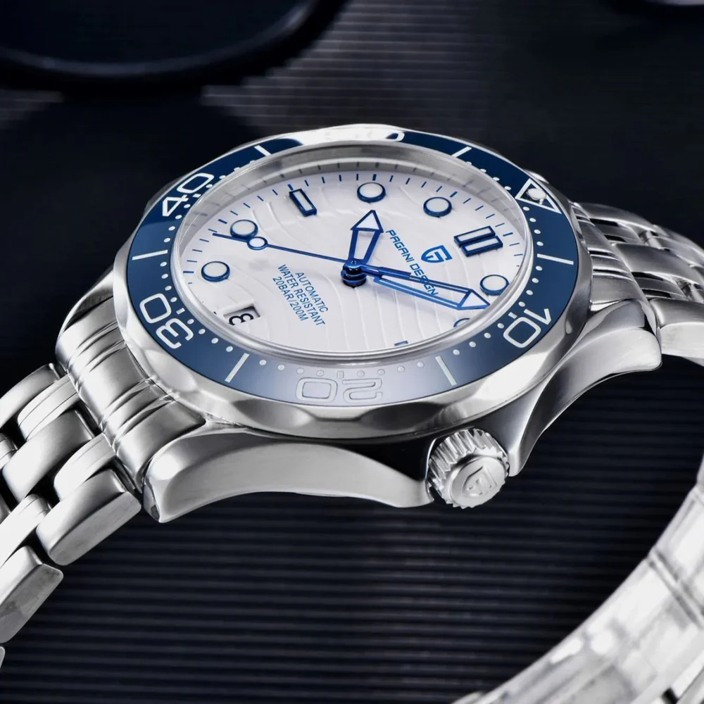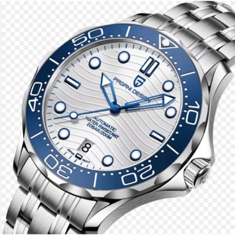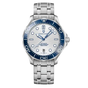 Pagani Design PD-1685 Seamaster White Blue, dayanıklılığı, güçlü mekanizması ve şık tasarımı ile saat koleksiyonlarında öne çıkan etkileyici bir modeldir.