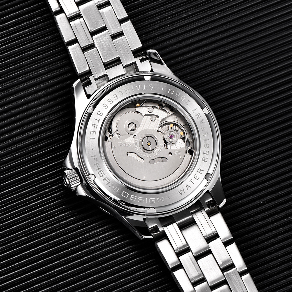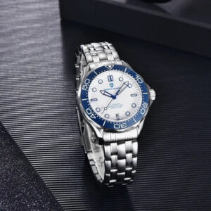 Paslanmaz çelik bilezik kordon, saatin sağlamlığını artırırken günlük kullanımda konfor sağlar. Modern tasarımı ve güçlü teknik özellikleriyle Pagani Design PD-1685 Seamaster White Blue, hem spor kombinlerde hem de günlük kullanımda stilinizi tamamlayan ideal bir otomatik saat modelidir.