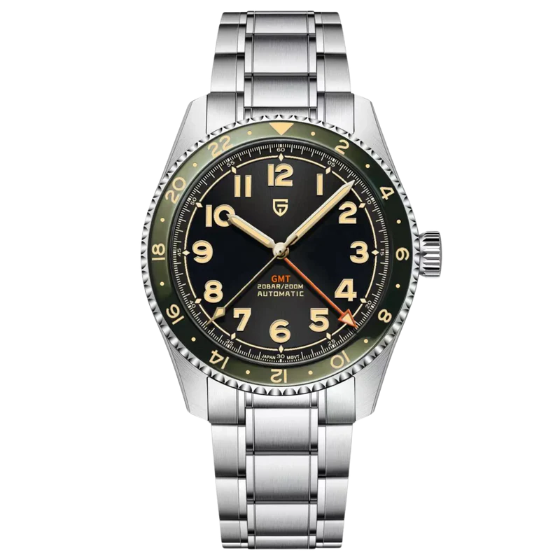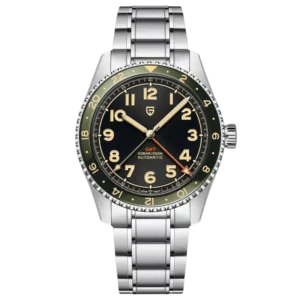 Seiko NH34 Otomatik GMT Hareketi – Çift zaman dilimi işlevine sahip otomatik GMT mekanizmasına sahip saatimizin çok yönlülüğünü deneyimleyin. Güvenilir Seiko NH34 mekanizmasıyla donatılan bu saat, dünyanın iki farklı noktasında programınızı korumanızı sağlamanın yanı sıra etkileyici 42 saatlik güç rezervi de sunuyor. Sık seyahat edenler veya farklı zaman dilimlerinde seyahat etmek zorunda kalanlar için idealdir.