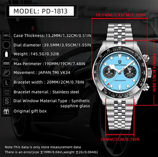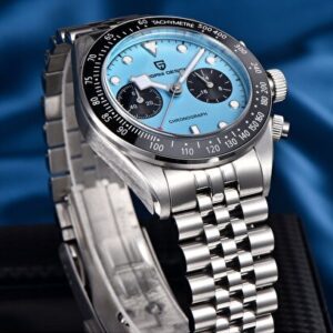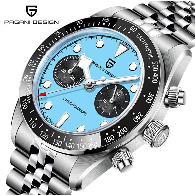Sportif şıklığı teknik güçle birleştiren Pagani Design PD-1813, mavi kronograf kadranı ve full çelik yapısıyla zamansız bir stil sunar. Günlük kullanımda olduğu kadar iş ve özel kombinlerde de güçlü bir duruş sergileyen bu model, Japon mühendisliğinin hassasiyetini bileğinize taşır.