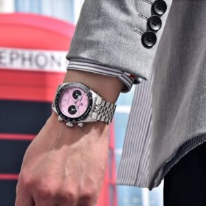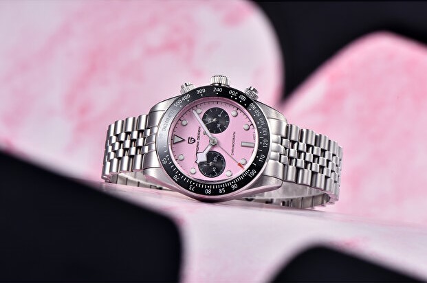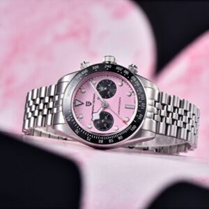 Şık pembe kadranı, safir cam koruması ve VK34 kuvars mekanizmanın hassasiyetiyle Pagani Design PD-1813, zamansız bir kronograf arayanlar için güçlü bir seçim. Hem şehir temposunda hem de sportif kombinlerde net bir stil imzası bırakır.