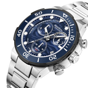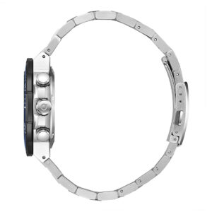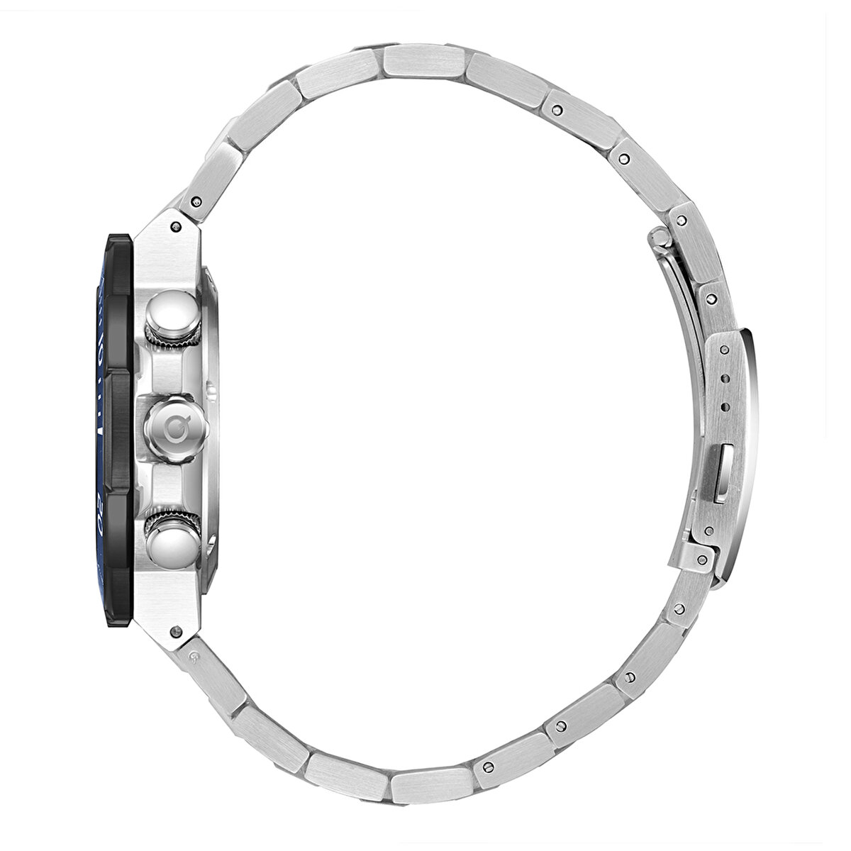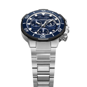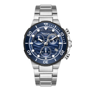 42 mm paslanmaz çelik kasa, döner lacivert bezeliyle sportif bir dinamizm kazandırır. Dalgalı kronograf koyu lacivert kadran, detaylı alt göstergeleriyle profesyonel bir görünüm sunar.