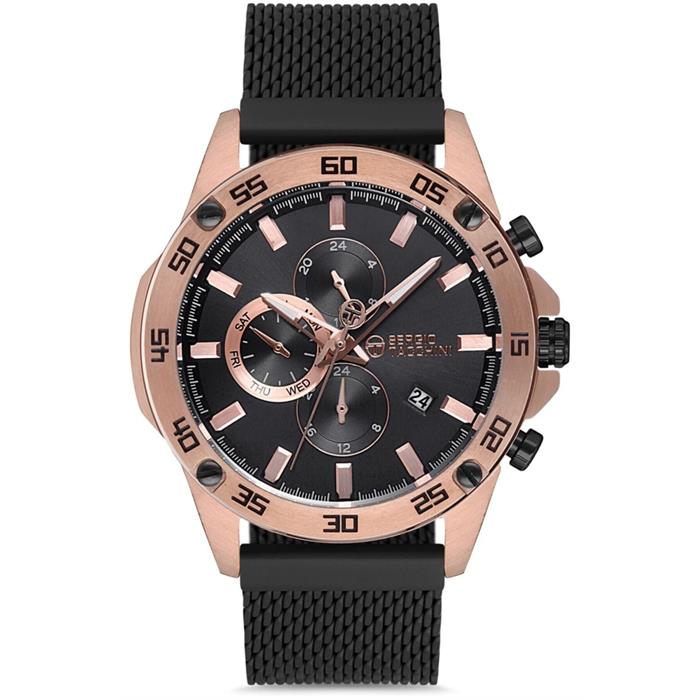 Şıklığı detaylarda saklayanlar için… Sergio Tacchini ST.1.10041.3A, bakır renk çelik kasasıyla lüks ve modern bir duruş sergilerken, siyah deri kordonu ile bilekte son derece zarif ve konforlu bir kullanım sunar. 45 mm büyük kasa çapı, güçlü bir görünüm isteyen erkekler için ideal ölçüdedir.