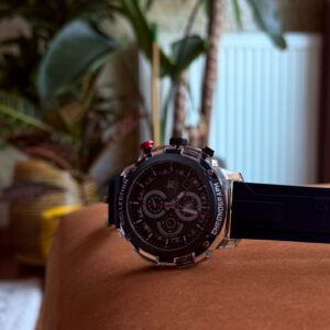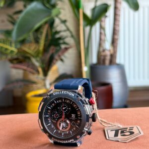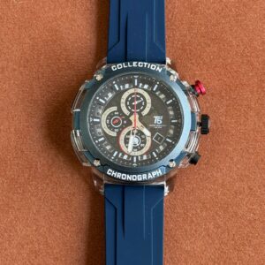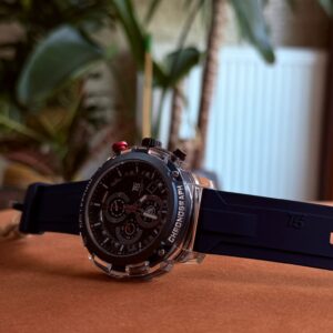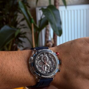 Lacivert silikon kordon, hem konforlu kullanım hem de sportif şıklık sağlarken kronograf fonksiyonu saatin dinamik yapısını tamamlar. Mineral cam, günlük kullanıma uygun dayanıklılık sunar.