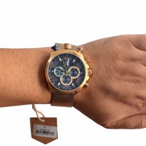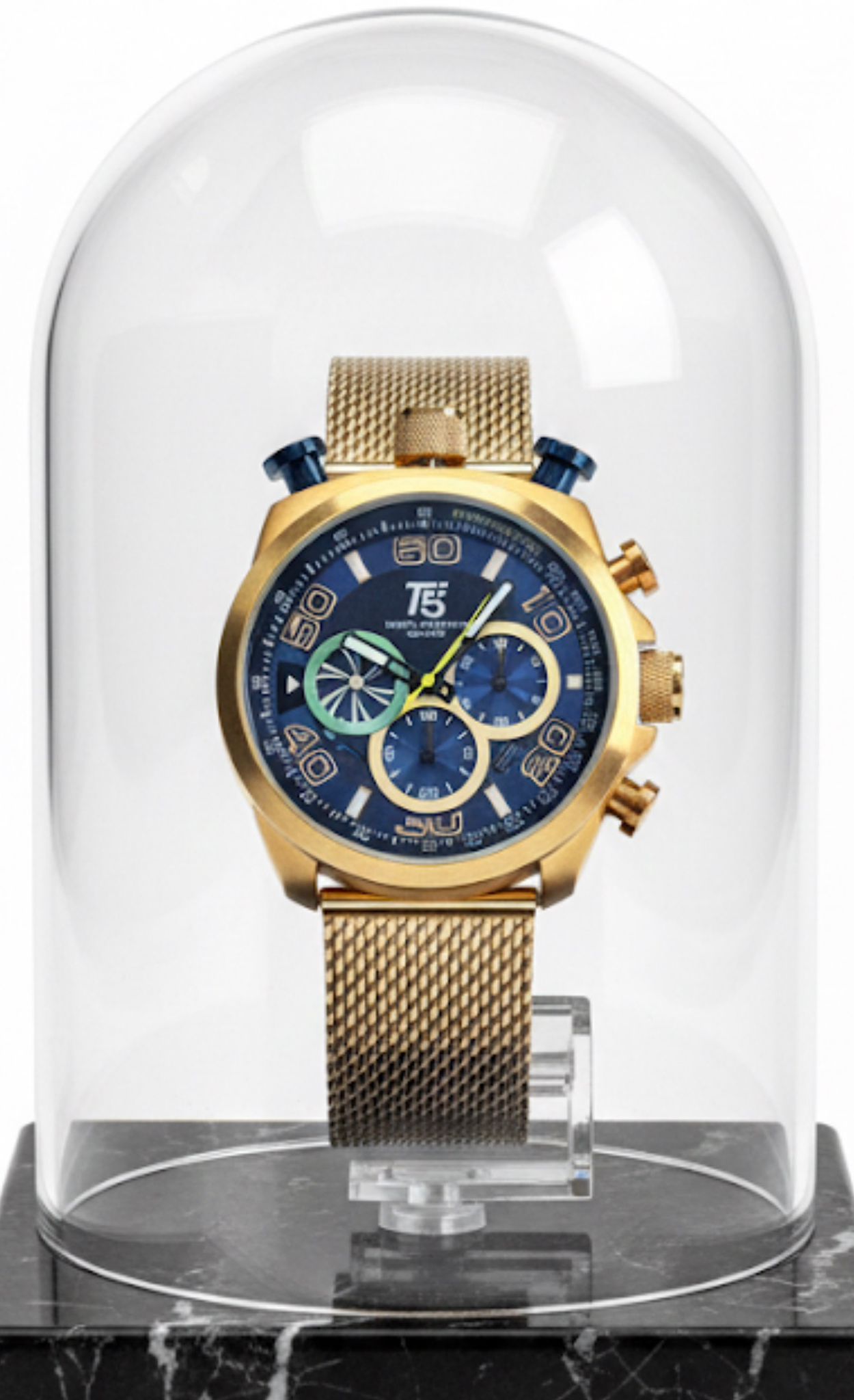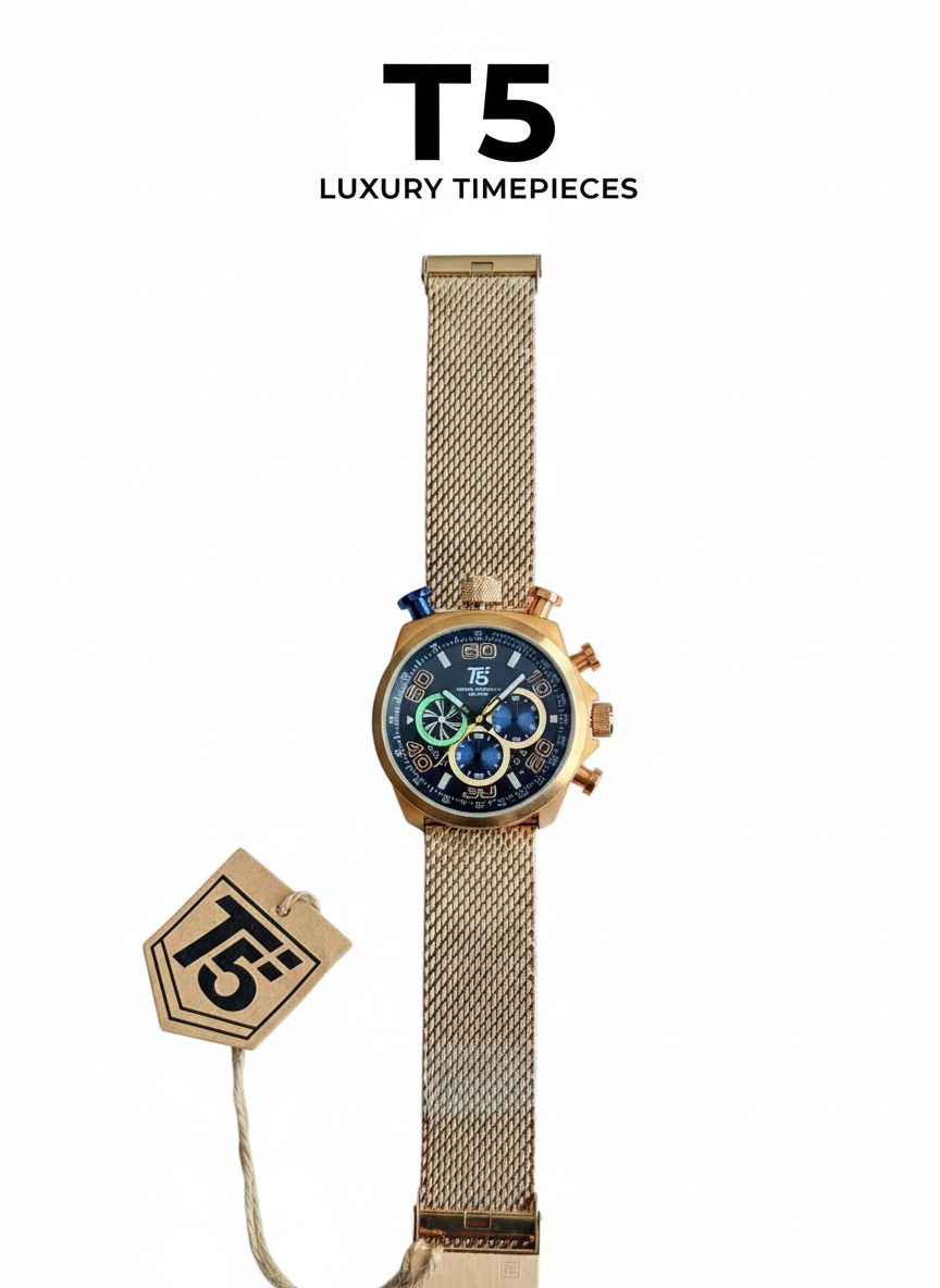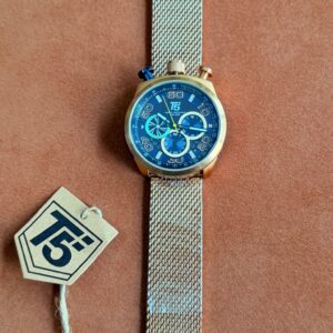 Şıklığı ve modern çizgileri bir arada sunan T5 H3748G-04, gold hasır kordonu ve güçlü kasa yapısıyla stiline değer katmak isteyen erkekler için tasarlandı. 44 mm kasa çapı, bilekte etkileyici ve net bir duruş sergilerken kronograf detaylar saate sportif bir karakter kazandırır.