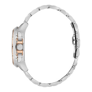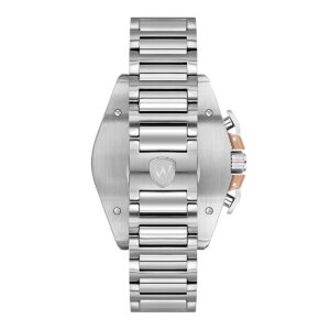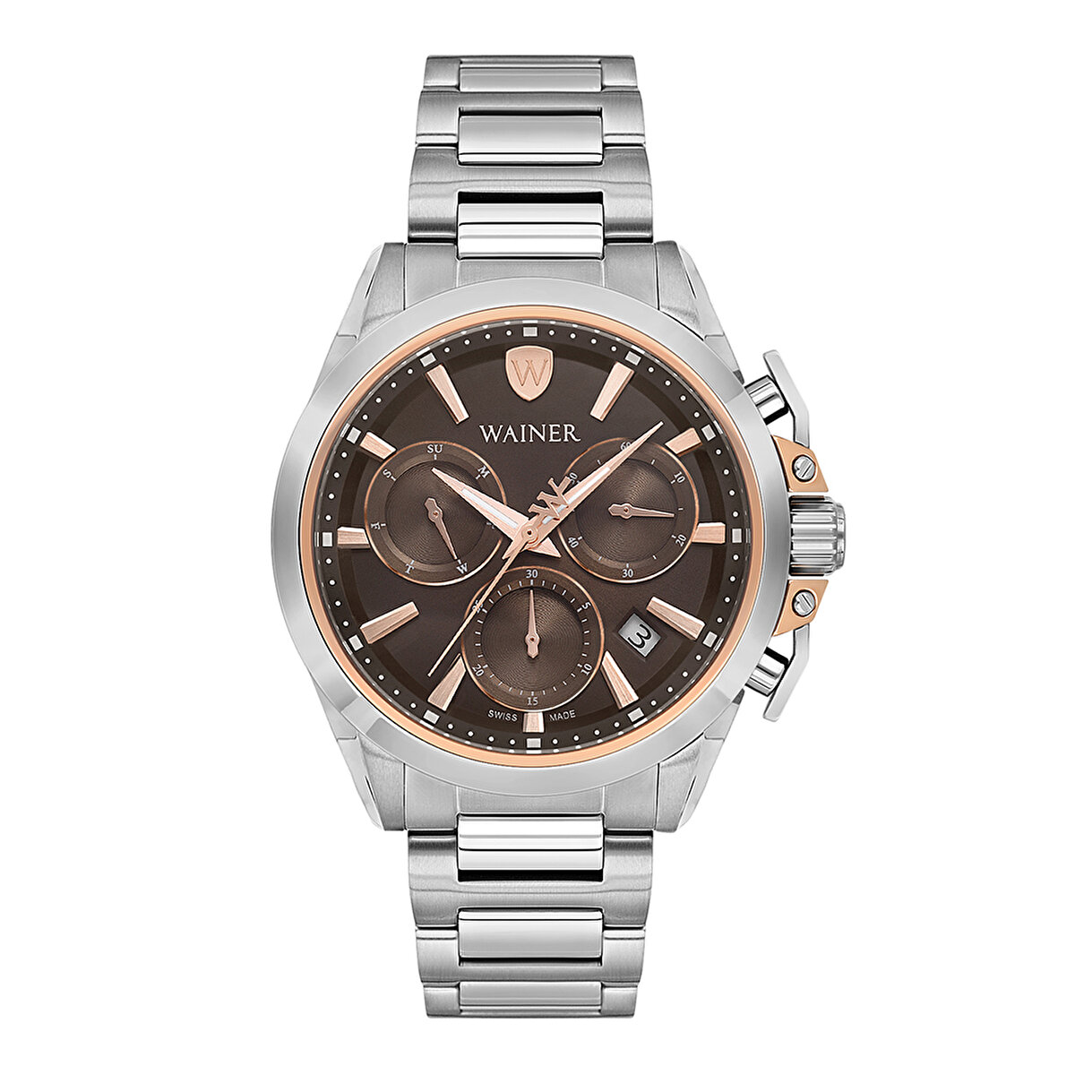 44 mm gümüş renkli kasası ve paslanmaz çelik gümüş kordonu, zamansız bir duruş sunarken; iç kadrandaki kahverengi kronograf detaylar saatin karakterine sofistike bir hava katar. Saat 5 yönünde konumlandırılmış takvim penceresi, fonksiyonelliği zarif bir şekilde tamamlar.